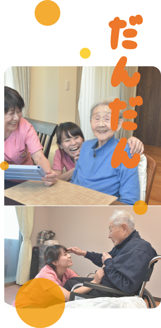 「住み慣れた自宅で安心した生活を継続し家族に見守られながら最期を迎えたい」「ただ今」を大切にして「ただいま、おかえり」と家族全員で言いあえる場所であって欲しい私たちはご利用者様とその家族それぞれの思いを大切にしますまた、不安や心配ごとを解消するため細やかで温かいサポートを心がけよりたくさんの‘ありがとう‘をいただけるようにします
